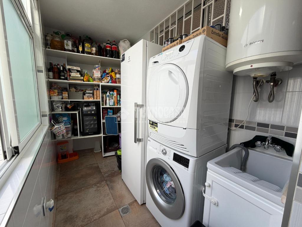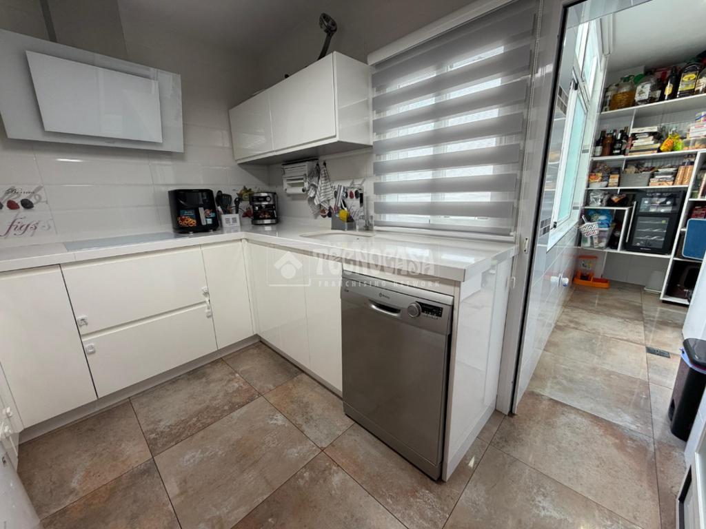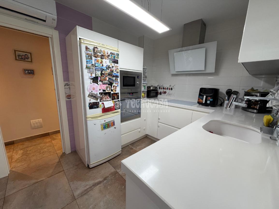 Un pasillo distribuye el resto de la vivienda, que cuenta con tres dormitorios exteriores. El dormitorio principal dispone de baño privado completo con plato de ducha. La cocina se encuentra totalmente equipada, también con split de aire acondicionado, y comunica con un amplio lavadero independiente con zona de despensa. Además, la vivienda cuenta con un segundo baño completo con bañera.